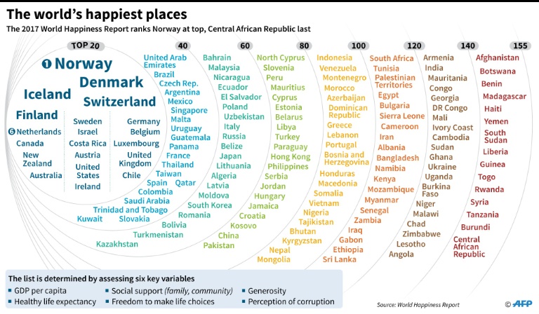 根據「聯合國2017年世界幸福報告」,挪威、丹麥、冰島和瑞士在報告中是「緊密包在一起的」。排在前十位順序是芬蘭、荷蘭、加拿大、紐西蘭、澳大利亞和瑞典。