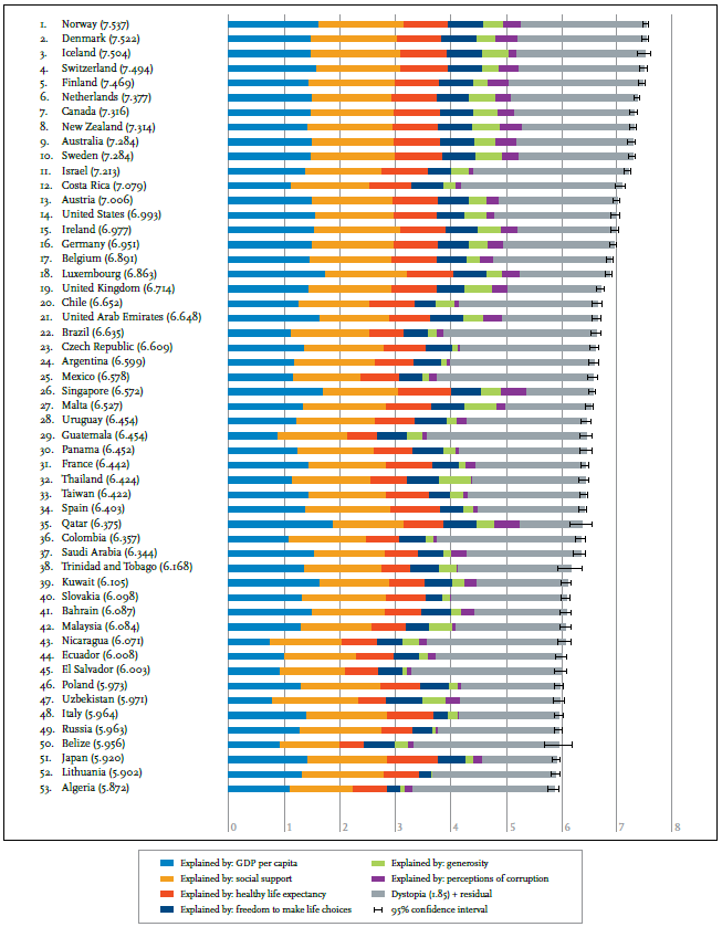 前十名的其他國家在所有六個關鍵因素中都有高分,用於解釋國家之間的幸福差異,通過收入、健康的預期壽命、依靠度、慷慨、自由和信任。
