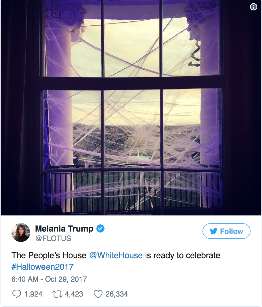 Melania Trump向她的社交媒體帳戶張貼了一張照片,從白宮內部望出來,展示了一個不滿蜘蛛網的窗口,寫道:「人民之家@WhiteHouse準備慶祝 #萬聖節2017年。」
