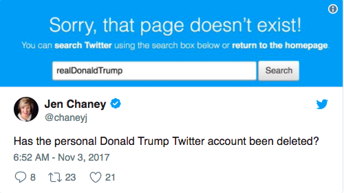 周四傍晚7:00左右,當人們在推特上搜尋川普的個人帳號@realDonaldTrump時,有整整11分鐘的期間,網站上都顯示著這個帳號不存在。