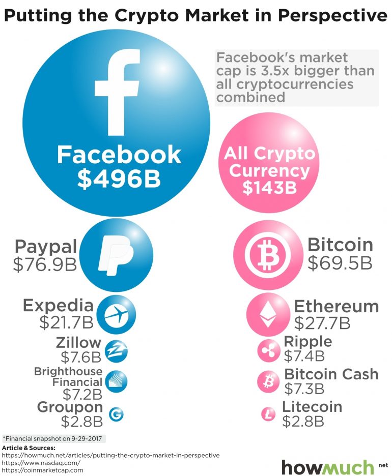 依據此圖,加密貨幣以總計1430億美元的市值計算,大約是Facebook市值的1/3左右,也超過了Paybal、Expedia、Zillow和Groupon。