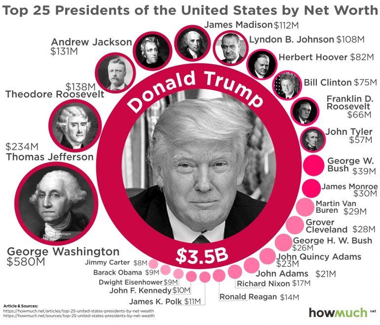 從這張圖表中顯示,川普的個人財富遠遠超過其他任何人。事實上,他甚至比所有總統加起來的財富還要多。川普一個人的財富是35億,而所有總統加起來也才約19億美元。