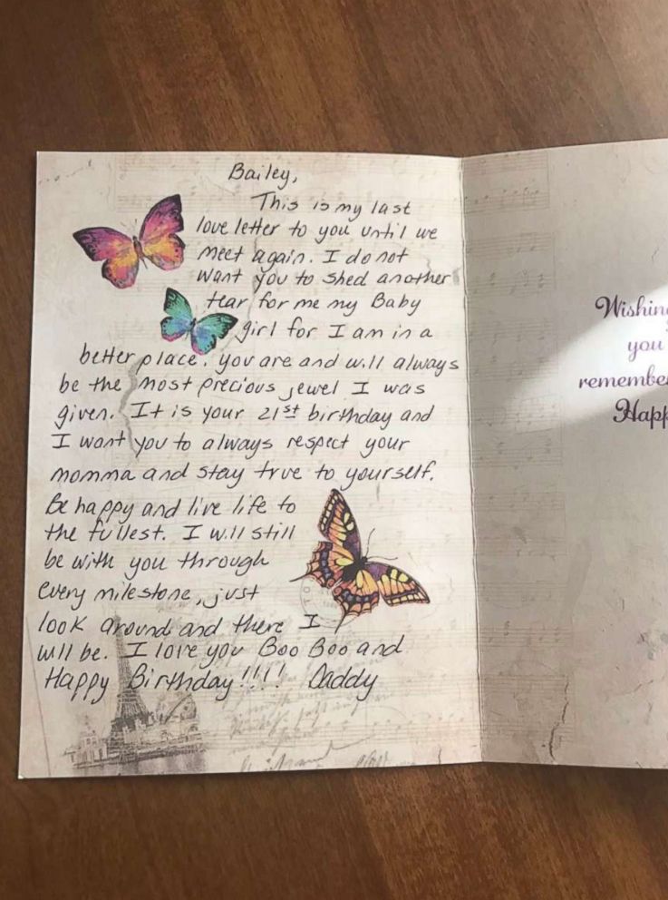 Bailey Sellers在推特上寫了一篇文,內容說她的父親Michael從她17歲開始就每年生日都會送她一束花,並保證會一直送到她21歲的生日。於是在11月26日,21歲生日的前兩天,她收到父親送的最後一束花,是一束紫花。同時她還收到一封來自父親感人的卡片,部分的內容寫道:「Bailey,這是我與妳相見之前送妳的最後一封情書了。希望妳不要再為我流一滴淚了,我的寶貝女孩,因為我已經在一個更好的地方了。」而Bailey也說:「我看到內容時真的很開心。」
