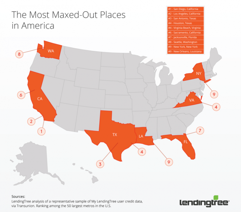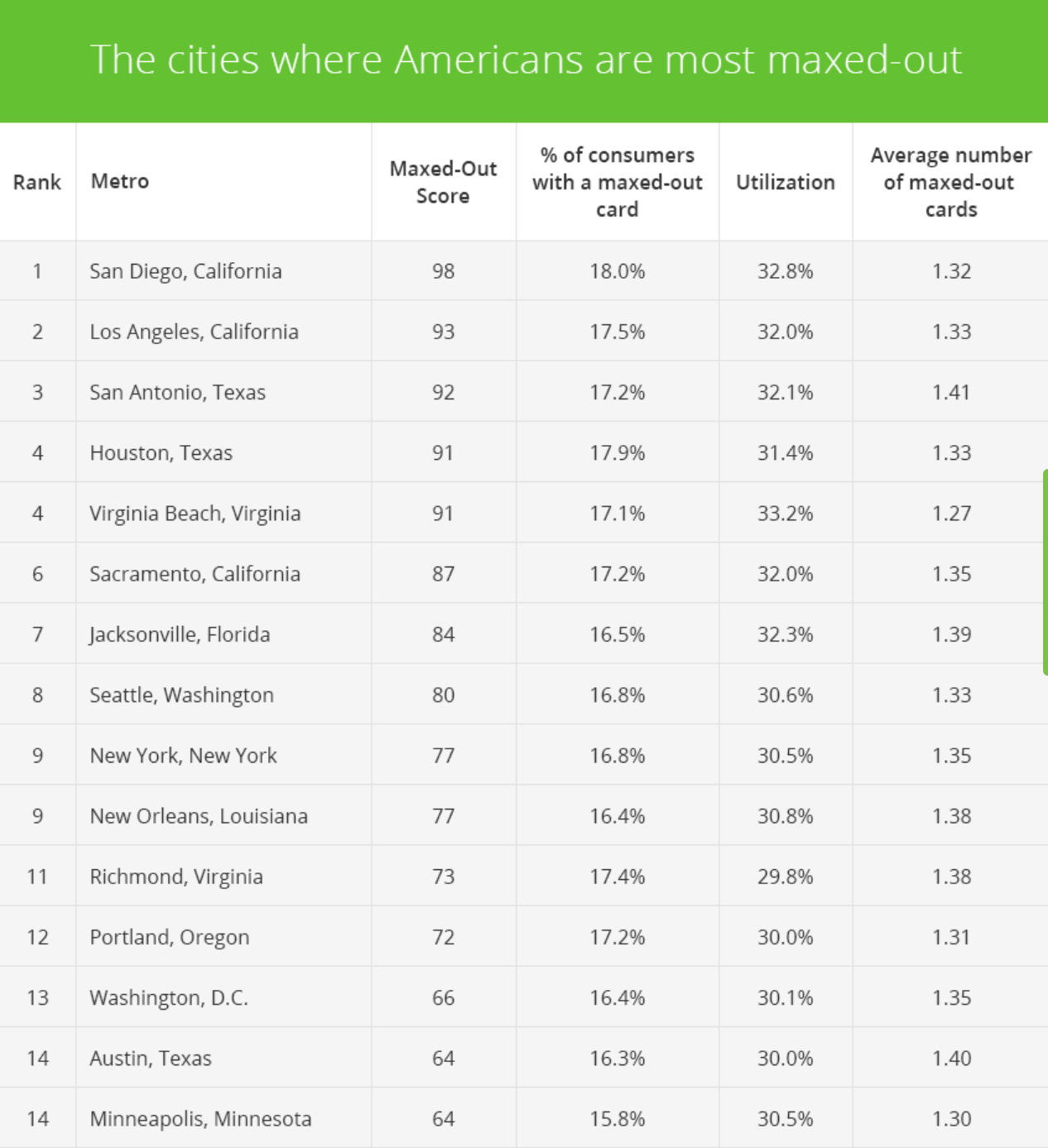 LendingTree試圖找出美國哪些城市真正被卡債淹沒時,我們不只看人們耍爆卡的地方在哪裡,同時也研究了卡片的餘額與總信用額度有多高。從50個最大的都市地區的100多萬匿名My LendingTree用戶開始,然後,創建了一個介於0到100之間的「Maxed-Out Score」。