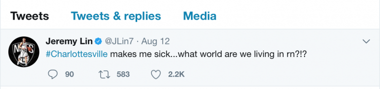 林書豪於Twitter上表示:「發生在夏洛特維爾的事情令我作嘔,我們生活的世界到底怎麼了?(#Charlottesville makes me sick…what world are we living in rn?!?)」