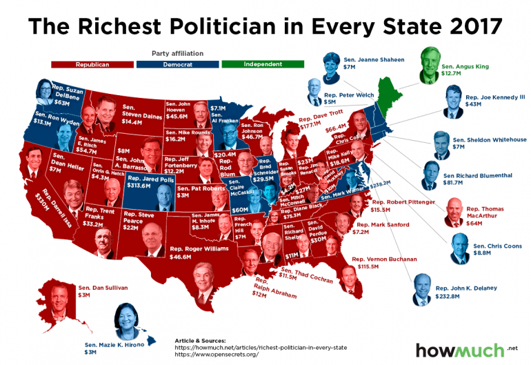 34個州最有錢的政治人物是共和黨人,而15個州最有錢的政治人物是民主黨人,1個州最有錢的政治至人物是獨立黨。有趣的是,各州最富有的政治人物都是在國會。 沒有行政部門的政治家,包括州長。