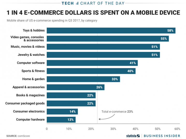 而根據市調公司 comScore 的數據資料,現在美國有四分之一電子商務的顧客來源是從行動設備上來的,正如統計資料庫 Statista 的這張圖顯示,部分類型的產品甚至在行動設備(手機、平板電腦)上的銷售尤其更好。