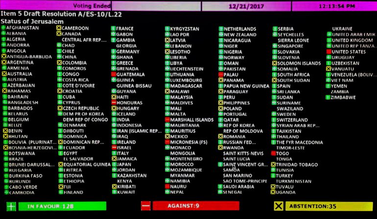 一面倒的結果顯示128票同意對上9票反對,絕大多數的國家都公開的反對川普政府的決議,並且要求美國撤銷在12月6日公布的聲明。