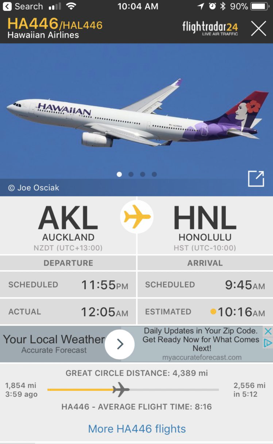 美國廣播公司的運輸記者Sam Sweeney在Twitter上寫了一張關於時空旅行的照片,寫道:「由於航班意外的延誤,夏威夷航空公司的飛機將於2018年起飛,並將於2017年著陸。」
