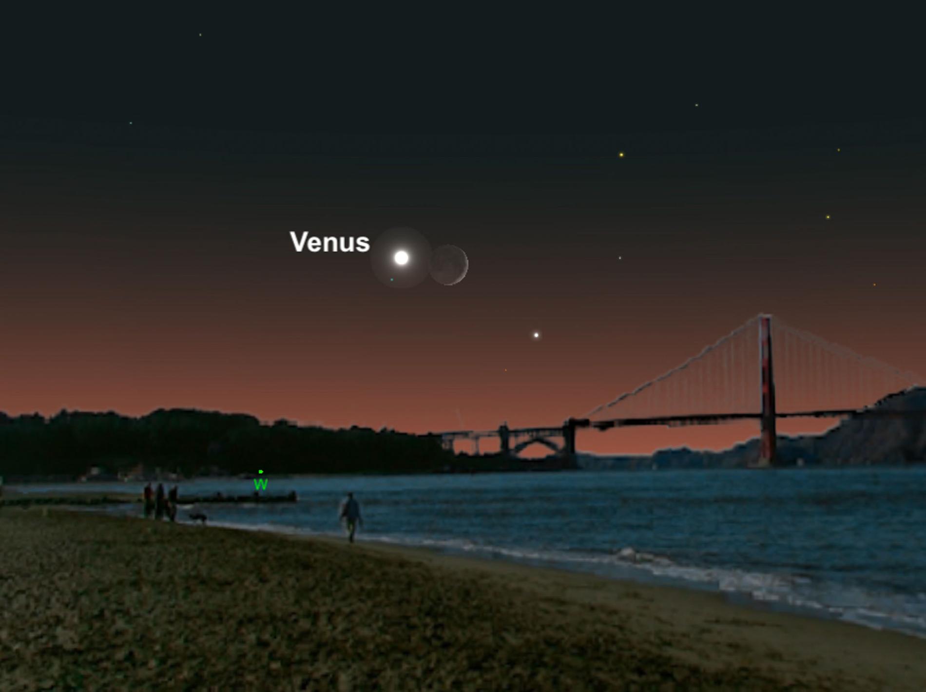 在日落時刻,觀察天空的人們可以找到薄薄的新月與西南天空上的金星相遇。北美的觀察者為最佳角度,能夠看到最接近的兩個世界。