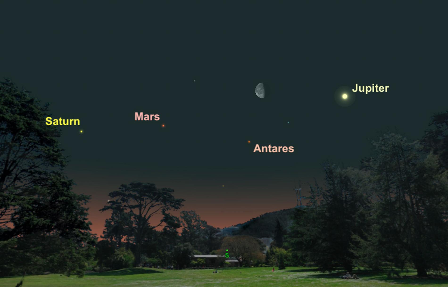 二月下旬和三月初早起的民眾就能夠觀察到黎明時分,東南部天空的行星排列,因為土星、火星和木星在天空中彼此徘徊。從3月7日開始的幾個晚上,殘月與各大星球會同時出現。