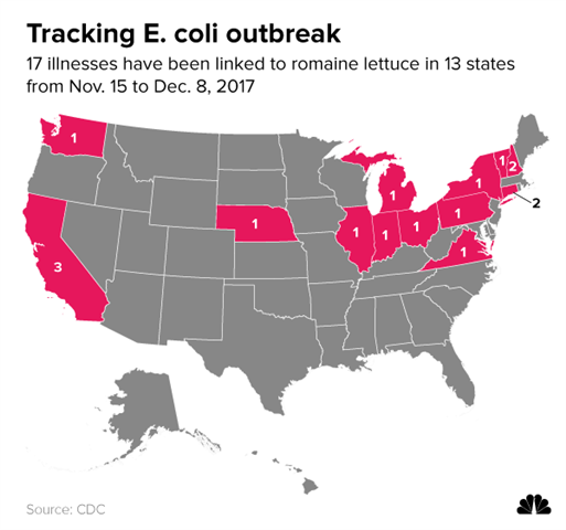 CDC報告表示在十一月份就爆發疫情,至12月28日,大約17個人分佈在十三個州都染病。CDC表示:「由於我們尚未發現感染源,美國疾病預防控制中心無法警告美國居民是否應該避免某種特定的食物。」