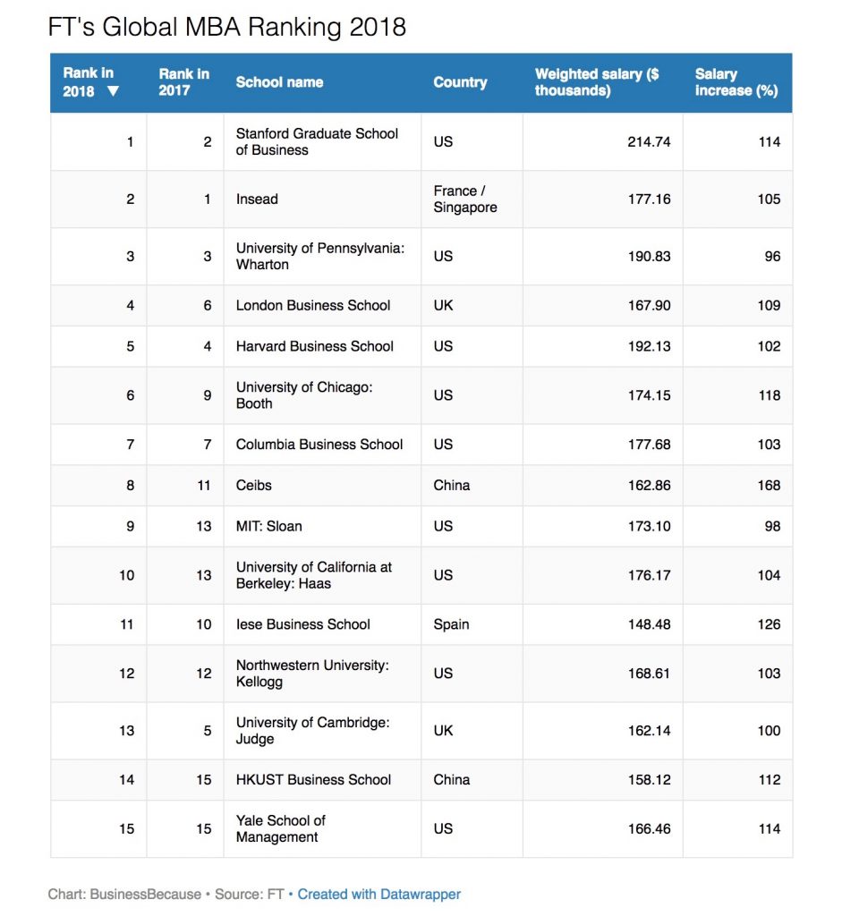 資料來源:Stanford Is The World’s Best Business School, Says The FT’s Global MBA Ranking 2018