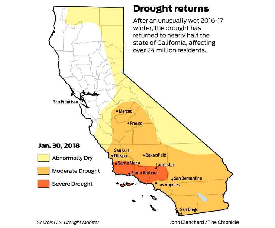 資料來源:With storms skipping state, nearly half of California is back in a drought