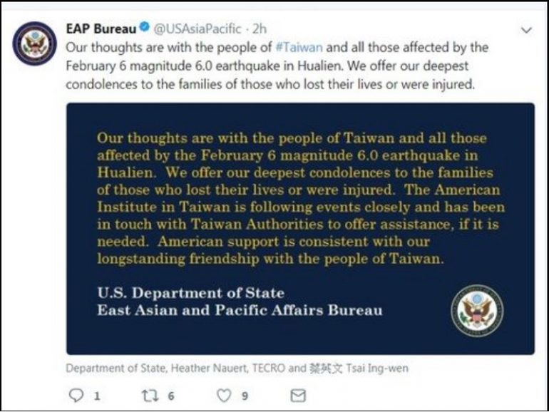 資料來源:US offers condolences over deadly earthquake in Hualien