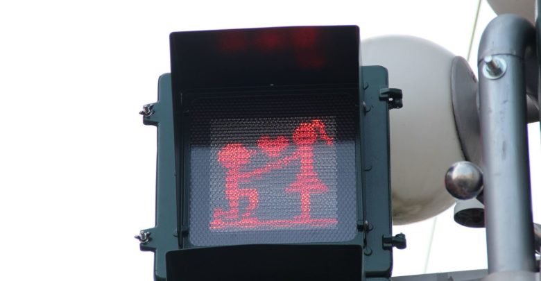 屏東警察署設計了兩個行人過馬路,讓號誌更吸引人。根據此計劃,紅燈時小綠人會跪下來牽起女朋友的手。