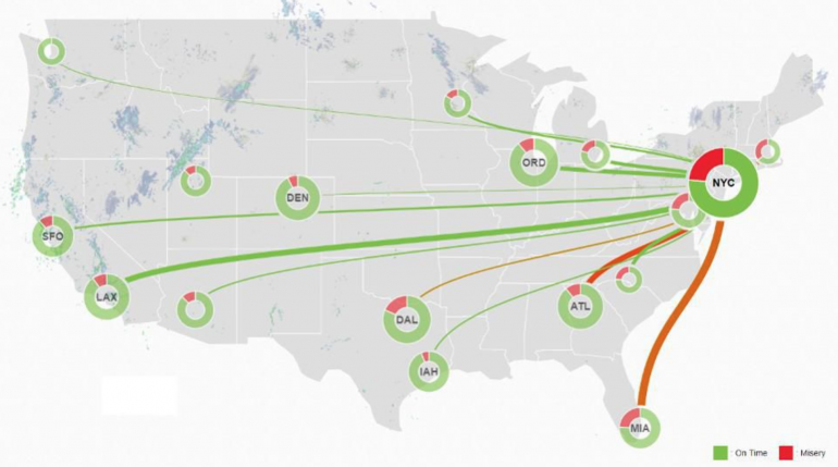 包括新英格蘭地區在內的美國東部地區,迎來今年的第二個東北風暴,造成美東地區地航班大混亂,週五時紐約和華盛頓特區取消了 2,300 多個航班,而從航空追蹤網站 Flightaware 於週六更新的 Misery Map 中,可以看得出來航班取消及延誤較嚴重的地區集中在三大都會區。