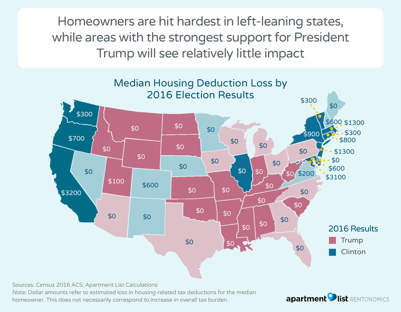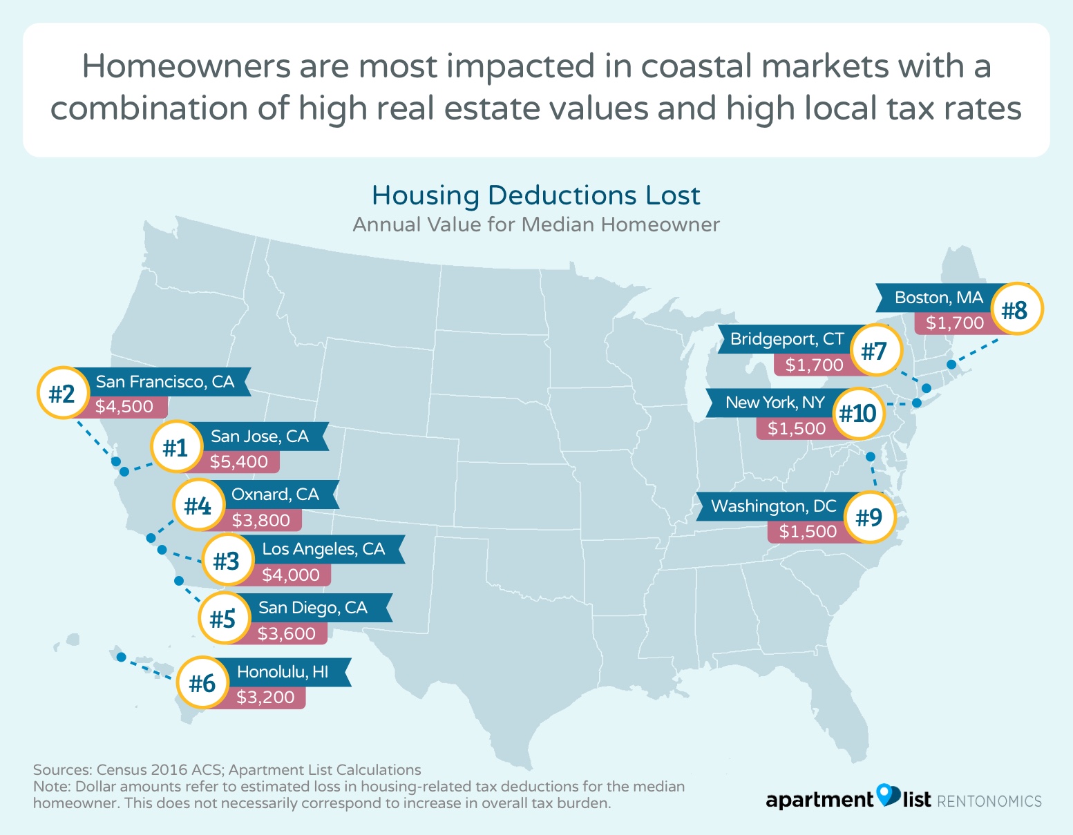 在加州聖荷西大都會地區的屋主,在新法下每年的住房稅扣除額將減少5,400美元;在舊金山的大都會區中的屋主,在新法下每年的住房稅扣除額將減少約4,500美元;在波士頓大都會區中,房屋中位數的屋主扣除額將減少1700美元。對於灣區中等價位房屋的房主,在30年期抵押貸款的過程中,損失的扣除額可能超過10000美元。而扣除額減少最多的前五名中,都在加州。