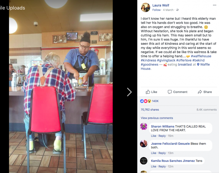 但就在這天,一個等待服務的顧客看到了這個善良的舉動,便拍了照、上傳到她的臉書上。她的貼文上寫到,「我不知道她的名字,但我聽到這位老先生告訴她他不太能控制他的手。這位服務生二話不說地拿起老先生的盤子並開始切他的火腿。這可能是件小事,但我相信對他來說這是件很大的事。現在的社會總是讓人感覺好負面,我真的很感謝我能看到這麼善良的行為。我們都應該像這位服務生一樣幫助他人……」