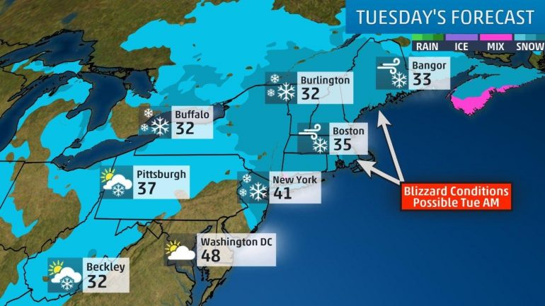 到了星期二早上,大雪將會覆蓋賓州東部、紐澤西州、紐約中部及東部、新英格蘭州,但不包括緬因州北部。