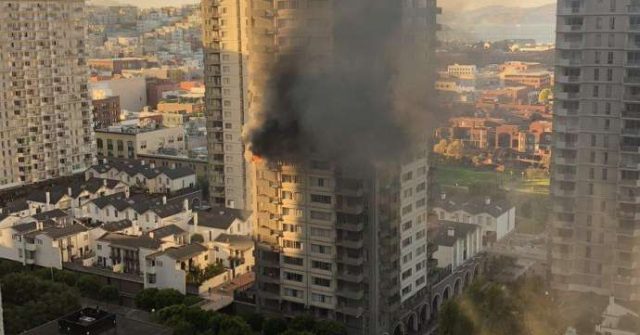 舊金山消防員熄滅金融街住宅區高樓爆發大火,濃厚的黑煙不停的升至空中,迫使裡面居民…