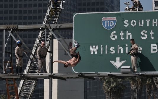 星期三早上,洛杉磯一名裸上半身、穿著白色球鞋的男子,跳上公路110的告示看板上,…
