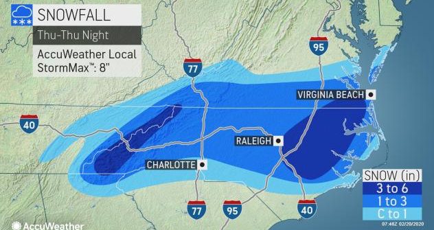 週四,預計將有一場冬季暴風雪襲擊北卡羅來納、南卡羅來納和弗吉尼亞州的部分地區,包…