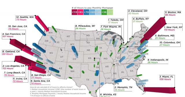 紅色的長條圖,意味著你必須工作超時,才能夠保有你的家,例如紐約、洛杉磯、邁阿密、舊金山。