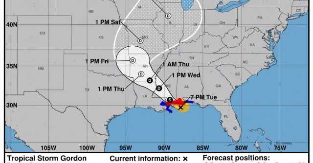 熱帶風暴 Gordon 正在穿越墨西哥灣,直直朝向密西西比沿海前進,在星期二晚上登陸。