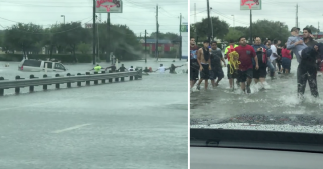 本週在休士頓,數十名善良的民眾奮力抵抗洪水、形成人形鏈,拯救被困在沉沒的車上的司…