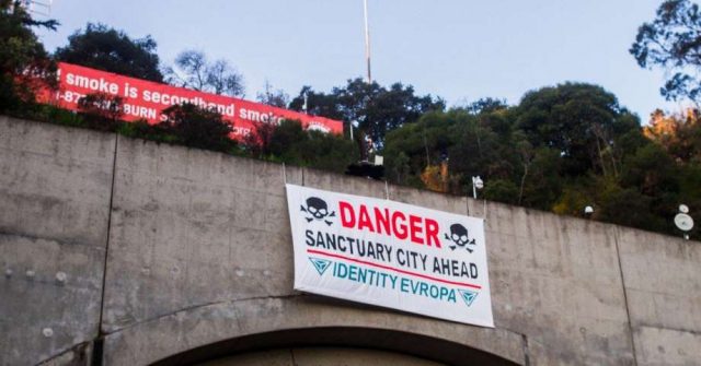 星期天,舊金山Yerba Buena隧道上懸掛著布條,上面用紅色字寫著「Sanc…