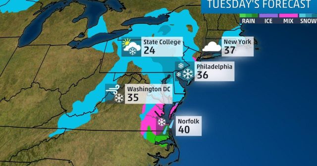 星期二,華盛頓特區、巴爾的摩、費城市區等等地區可能有少量降雪,交通繁忙的95號州際公路也可能受到影響。