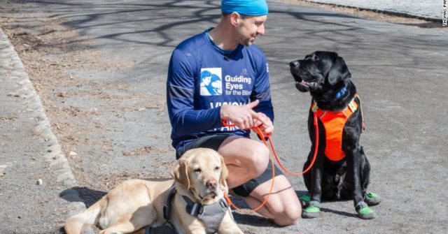 盲人跑者帕尼克(Thomas Panek)在他的三隻導盲犬威斯特利(Westle…
