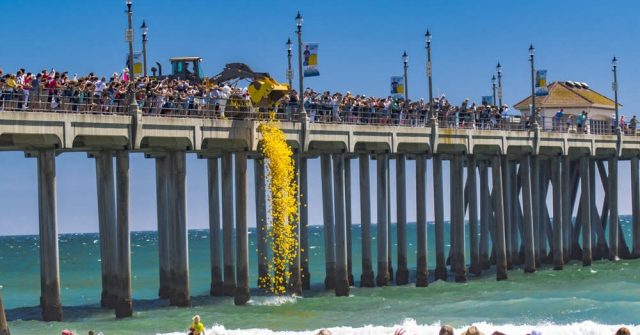 星期六,上萬隻塑膠製黃色小鴨齊聚在 Huntington 海灘碼頭,一同游向岸邊…