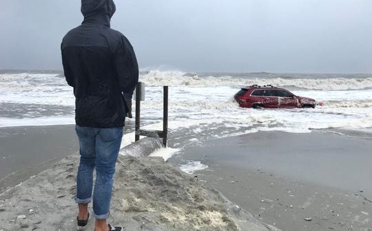 星期四,由於颶風 Dorian 抵達南卡羅萊納州之前引發的大浪,一輛栗色的吉普車…