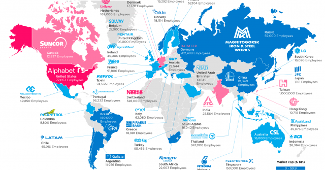 一家公司代表每個國家,按市值進行顏色區別。紅色國家的雇主價值超過100億美元,深…