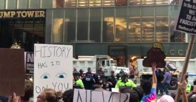 星期一傍晚抗議者聚集於川普大廈前,高喊「紐約討厭你!」(New York hat…