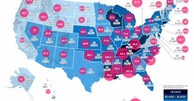 北達科他州的處方藥人均支出最低($734美元),濫用藥物的死亡人數也最低(68)…